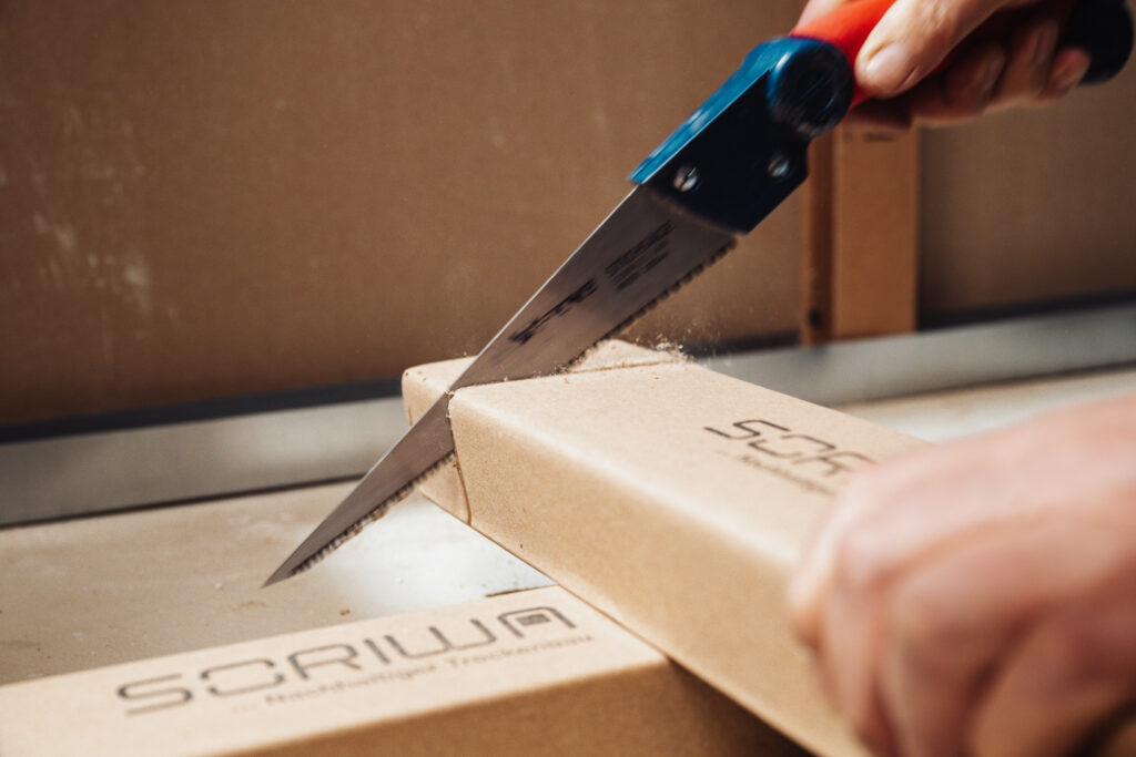 Auch mit einer gängigen Handsäge gelingt der Zuschnitt problemlos. Für ein sauberes Schnittbild empfehlen wir ein feinzahniges Sägeblatt für Holz. Ideal für kleinere Anpassungen direkt vor Ort.