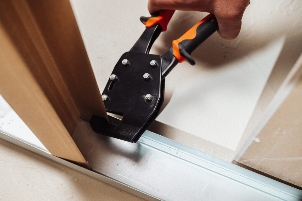 Die SORIWA Multi Profile lassen sich mit unterschiedlichen handelsüblichen Werkzeugen direkt auf der Baustelle zuschneiden – ganz ohne Spezialgerät. Besonders praktisch: Der Zuschnitt funktioniert mit einer herkömmlichen Blechschere, wie sie auch für klassische CW-Stahlprofile eingesetzt wird. Einfach die gewünschte Länge anzeichnen, Seiten einschneiden, Profil umknicken – und der Zuschnitt ist fertig.