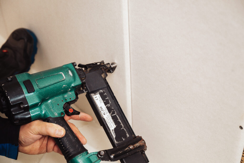 Eine besonders effiziente Variante zur Befestigung von Gipsplatten ist das Klammern oder Nageln. Mit dem passenden Druckluftnagler können Sie präzise und zeitsparend arbeiten – drei Klammern ersetzen dabei eine Schraube. Die speziell mit Prebena entwickelten Trockenbauklammern sorgen für sicheren Halt.