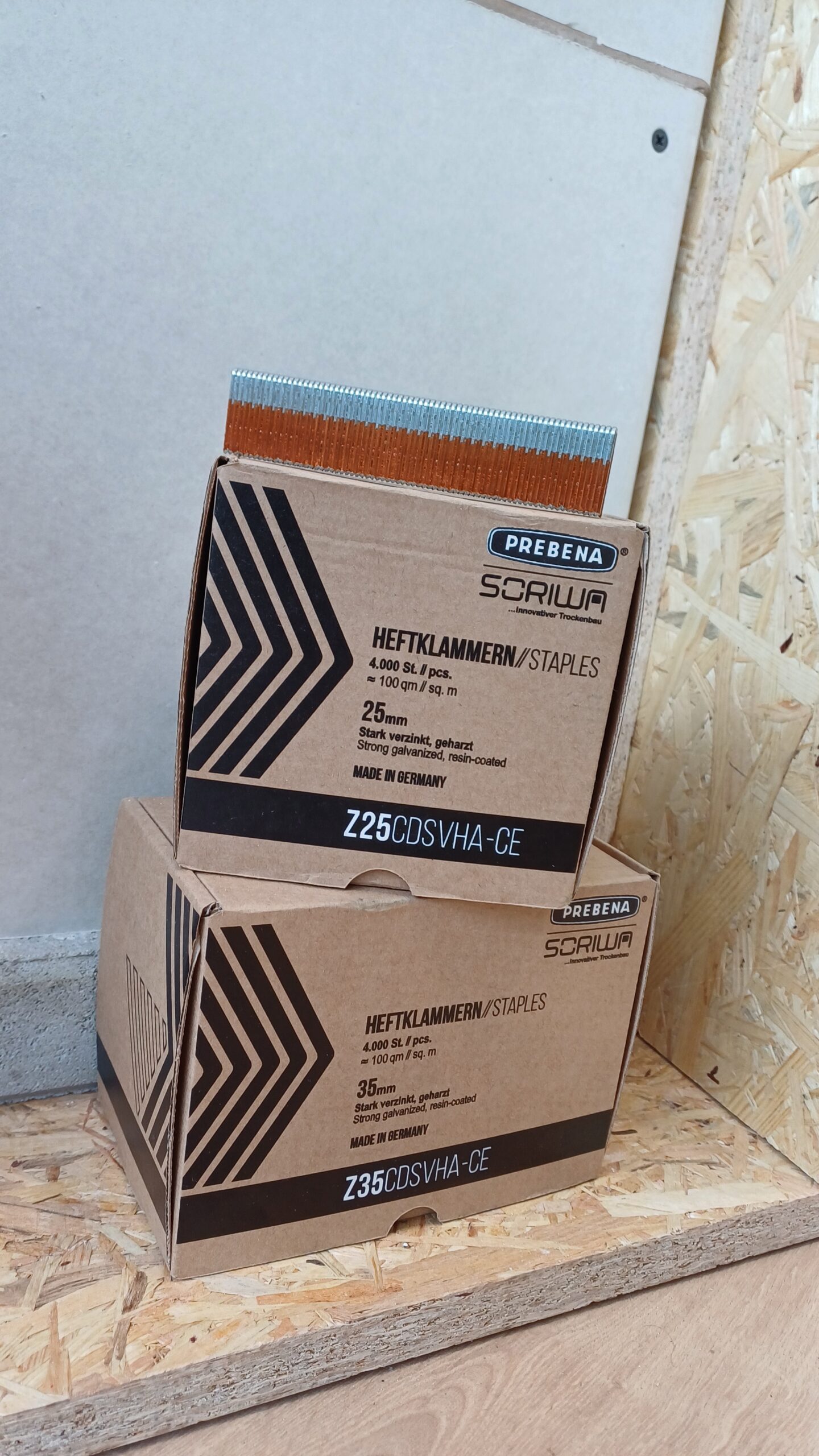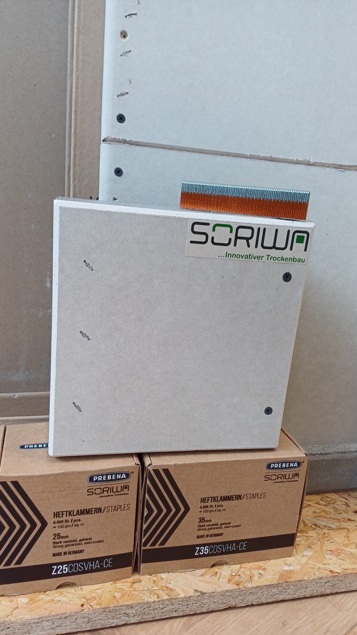 In Kooperation mit der Firma Prebena haben wir speziell entwickelte Heftklammern konzipiert, die eine schnelle und sichere Befestigung von Gipsplatten an den SORIWA Multi Faserprofilen ermöglichen – ganz ohne Schrauben.